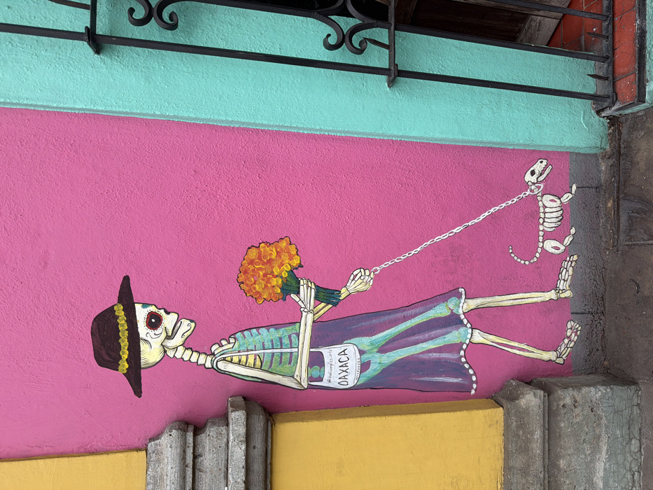 A vibrant mural depicts a skeleton figure wearing a hat and a dress with "Oaxaca" written on it, holding a bouquet of orange flowers
