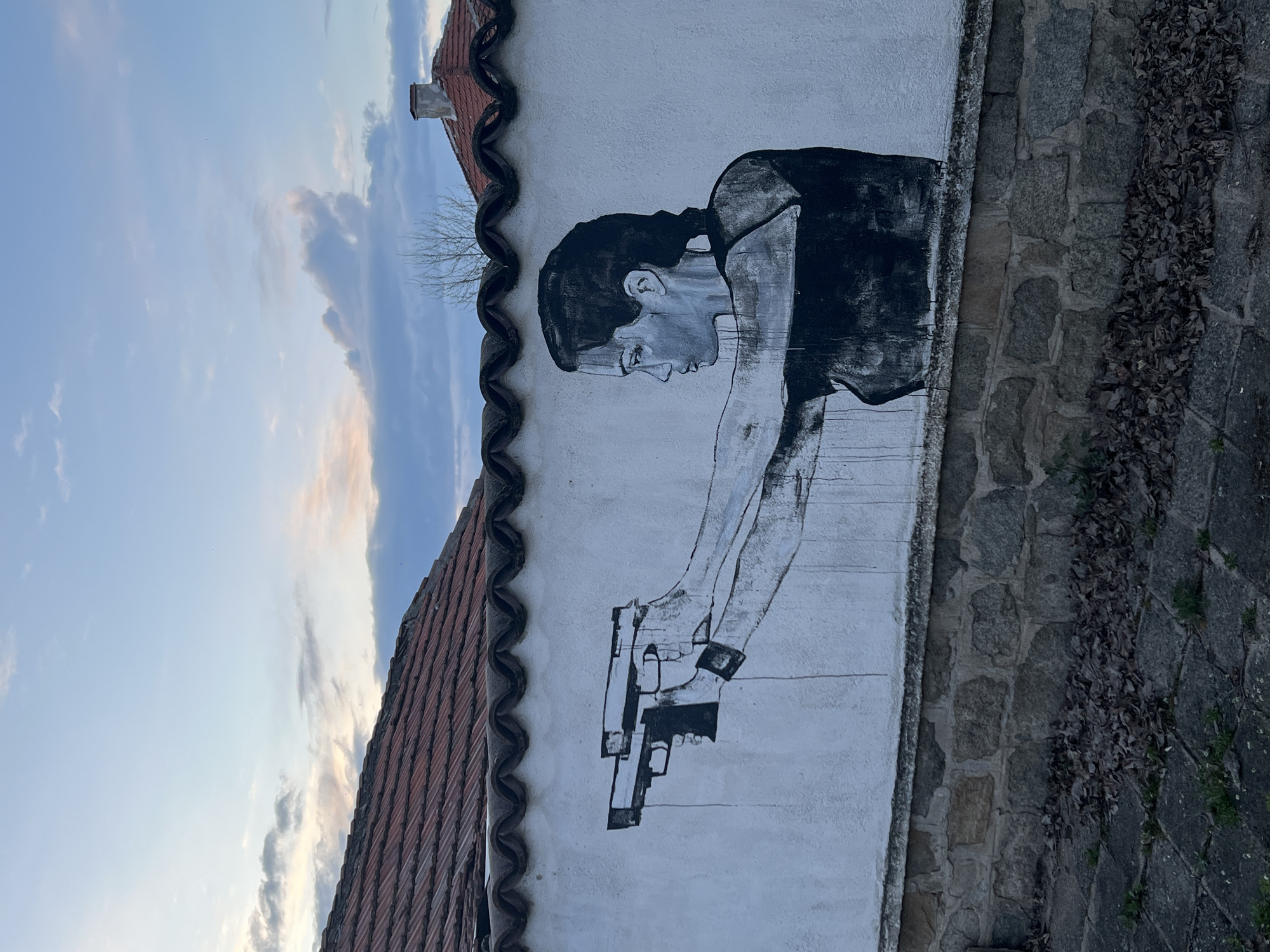A mural in Staro Zhelezare, Bulgaria, depicts a person holding two handguns. The mural is painted on a white wall bordered by a brown-tiled roof above and a stone wall below. The person in the mural is depicted in black and white, with their head bowed and arms extended, holding the guns. A sliver of blue sky with light clouds is visible above the roof. Dry leaves are present at the base of the stone wall.