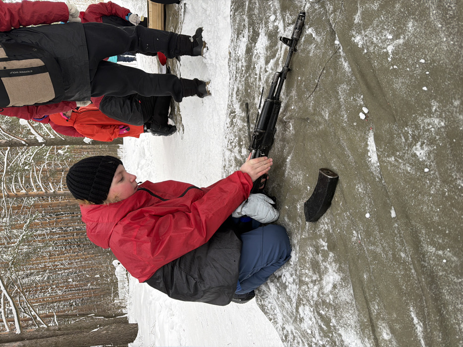 - "A person wearing a red jacket and a black knit hat is kneeling on a snow-covered tarp outdoors, apparently interacting with a black AK-47 rifle" by FM-48OzO2, licensed under CC BY 4.0