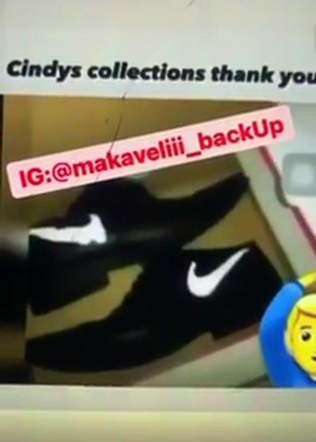 A smartphone displays a video of fashion footwear. The first image is a pair of black Nike sneakers in a box, and overlayed is a text graphic that reads “Cindys collections thank you IG:@makaveliii_backup.” The next scene shows a close-up photograph of a black distressed leather desert boot. The price listed is $1,288, with an offer of 15% off at checkout. Also overlayed is the text graphic “IG:@makaveliii_backup”.