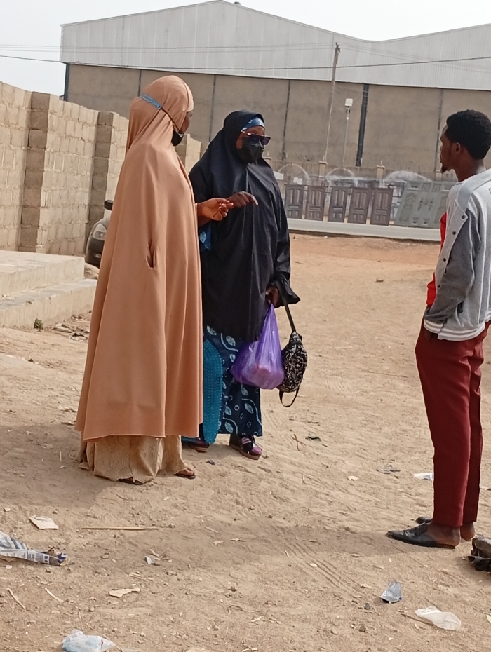 Three people are standing in a dirt lot near a building. Two women wearing face masks and modest clothing are facing a man. The woman on the left is wearing a tan head covering and the other woman is wearing a black head covering and sunglasses. The man is wearing a gray and white sweater and red pants. There are some building supplies and other items in the background.