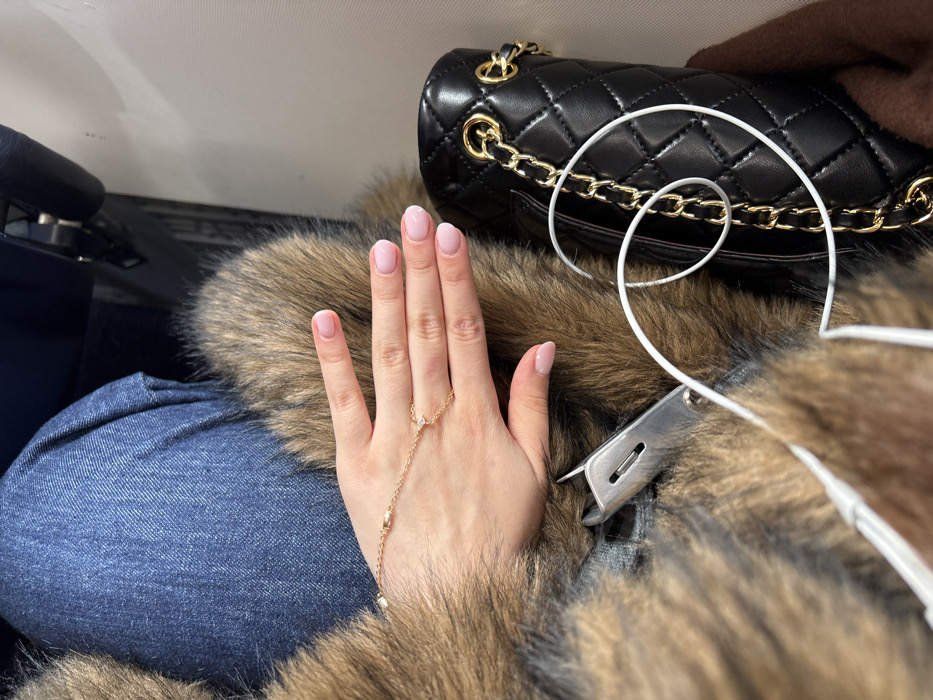 An overhead view captures a person seated in what appears to be a passenger vehicle, identifiable by a visible seatbelt buckle. The scene is located in Otopeni, Romania. The subject's left hand is prominent, displaying manicured fingernails with pink bases and white tips. A delicate gold chain accessory, featuring small beads and a triangular clear gemstone on the ring finger, adorns the hand, extending to a bracelet. The hand rests upon a textured, brown and black fur-lined garment, likely a coat or jacket. To the left, a section of blue denim jeans is visible. To the right of the hand, a black quilted leather handbag with a gold chain strap rests, partially obscured by the fur. A white cable, possibly from headphones, is coiled and draped over the bag and fur. A silver-colored seatbelt buckle is partially visible beneath the fur. The immediate background on the right consists of a plain, light-colored panel, typical of an aircraft or train interior. A dark seat structure is visible in the upper-right corner.