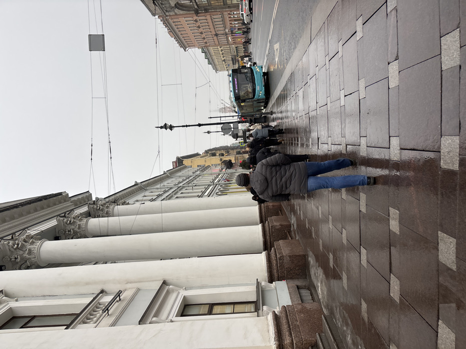 The image displays a wet urban street scene on Nevsky Prospekt, Saint Petersburg, Russia, captured under an overcast sky. In the foreground, a dark red-brown paved sidewalk with lighter grey square inserts is visibly wet, reflecting light. A male subject, viewed from behind, walks away from the camera. He is dressed in a dark grey hooded puffer jacket, blue jeans, and a grey knitted beanie. To the left, a large neoclassical building with a light grey facade features multiple tall white columns with ornate capitals. The base of the building is constructed from reddish-brown granite. Dark-framed windows are visible along its lower stories. Further along the sidewalk, a line of approximately ten individuals, dressed in dark winter coats and jackets, walks in the same direction as the foreground pedestrian. To the right of the sidewalk, a multi-lane asphalt road is present, also showing signs of wetness. A light blue trolleybus, bearing the route number "71" and "БТ" (BT) insignia, is positioned in the rightmost lane. Overhead power lines for the trolleybus system traverse the street. An ornate black lamppost stands between the sidewalk and the road. In the mid-ground and background, a continuous line of multi-story historical buildings with varied facade colors (pink, yellow, grey) extends along the street. A white passenger vehicle is partially visible further down the road. The sky is uniformly grey and overcast. Distant architectural spires, characteristic of Saint Petersburg landmarks, are faintly visible on the horizon.