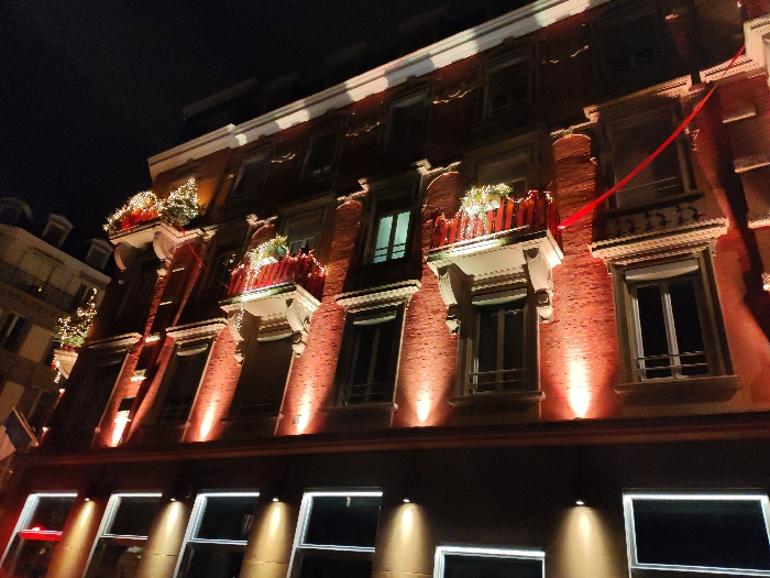 A multi-story brick building at night features illuminated balconies with railings and greenery on the upper levels. Each balcony is supported by ornate white corbels. Rows of windows with decorative frames are below and to the side of each balcony. The first floor has large windows with lights shining down from above. An arrow points to the upper right of the building.