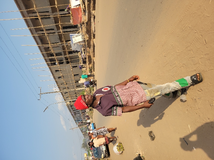 A person in a red cap, patterned shirt, and bandages on their leg stands on a sunlit street. A building under construction is visible in the background, along with other people and vehicles. The street appears sandy. The individual is casting a shadow, suggesting a sunny day.