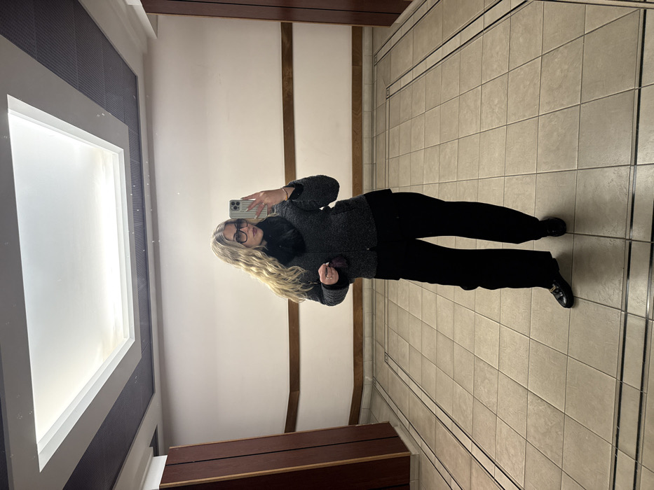 A woman is standing in what appears to be a bathroom with tiled floors and walls, and wooden accents. She is taking a selfie using a smartphone. She wears a dark-colored coat, dark pants, and glasses. Her blonde wavy hair is cascading down. The bathroom also has a large, rectangular window with bright light streaming in. The image is taken in a slightly off-center perspective.