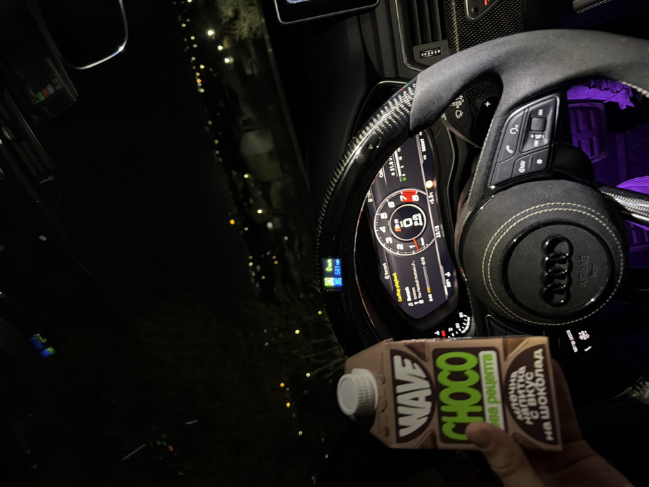 The image depicts a nighttime scene from the interior of a stationary Audi vehicle, overlooking a distant illuminated settlement. A human hand, likely the driver's, holds a light brown carton of "WAVE CHOCO" chocolate milk, labeled with Cyrillic text indicating "new recipe" and "milk drink with chocolate flavor." The car's interior features a multi-function Audi steering wheel with carbon fiber trim, Alcantara grip, and white stitching, bearing the "AUDI" logo and "AIRBAG" text. The illuminated digital instrument cluster displays "P" (Park), the time "23:18," "CarPlay playback" showing "Berserk" and "The Marshall Mathers LP" as music details, "21.4 V" (volts), "5.5 °C," and a boost gauge. A separate heads-up display shows "0 km/h" and "581 rpm." The driver's footwell is illuminated by purple ambient lighting. Beyond the vehicle's windshield, numerous blurred yellow and orange lights from buildings indicate a city or town at night, viewed from an elevated perspective. Silhouetted trees are faintly visible in the immediate foreground of the distant lights. The specific location within Kostinbrod, Bulgaria, cannot be determined from the visual information provided beyond indicating an elevated vantage point overlooking a settlement.