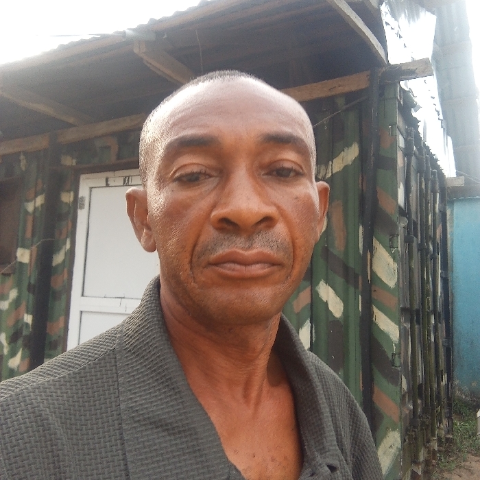 A middle-aged, bald African man poses for a close-up selfie. He wears a gray, collared shirt. Behind him is a building constructed of corrugated metal. The metal is painted with a camouflage pattern of green, brown, and white stripes. A white door is visible in the background. The building has a simple wooden roof structure. The man has a serious expression.