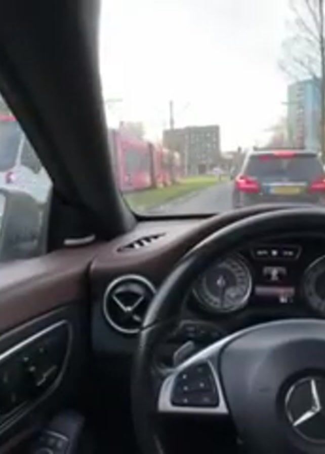 interior of a car, specifically the driver's seat area, as it sits in traffic. The car is a Mercedes-Benz, recognizable by its steering wheel and dashboard. The interior features brown leather accents. Outside the car, there is a city street with apartment buildings on one side and a tram driving by. There are other vehicles in the traffic, including cars and a yellow van. The view is from a first-person perspective, suggesting the video was taken by the driver.