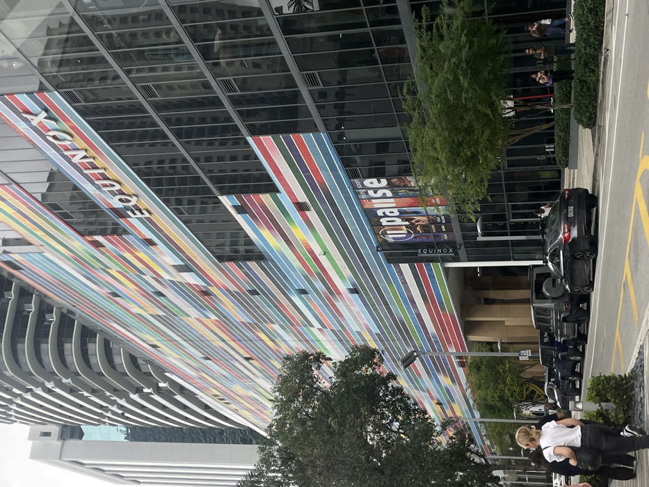 A modern building with a colorful striped facade houses "Equinox" and "Upause." People stand on the sidewalk near parked luxury vehicles. Trees partially obscure the building's lower portion. The building features a glass and metal exterior. The image has a slightly rotated perspective.