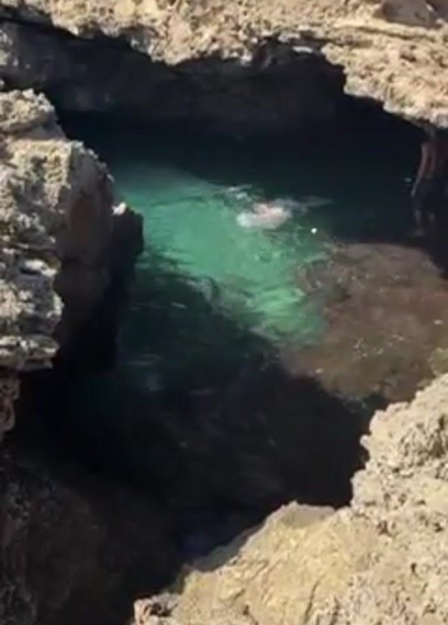rocky cove with clear, turquoise water. Two people are visible. One is already in the water, waist-deep. The other jumps into the water. They both appear to be swimming. The cove is surrounded by light-colored rock formations. Beyond the cove, a glimpse of the ocean can be seen.