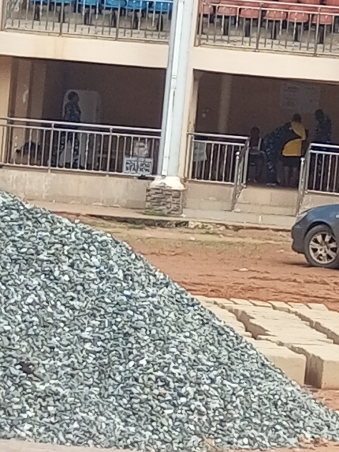 This image depicts an outdoor scene in Ajalli, Nigeria, alongside a two-story building. In the immediate foreground, to the left, is a substantial pile of light grey aggregate (gravel). To its right, on a reddish-brown dirt surface, lie multiple rows of light-colored rectangular blocks, possibly concrete pavers. The front wheel and lower body of a dark-colored vehicle with a multi-spoke silver rim are partially visible on the far right, parked on the dirt. The midground features the ground level of a light-colored building, presenting an open veranda or walkway shielded by a silver metal railing. On the left side of this veranda, a single individual dressed in dark clothing stands near a large, light-colored rectangular object. Further to the right within the veranda, a group of at least three individuals is present. One person wears dark attire with a distinct yellow garment or pattern over it, while others are in darker clothing. Their specific actions are indistinct. A small white sign with dark script is affixed to the metal railing in the center of the veranda. A tall, light-colored pole, featuring a stone-clad base, rises vertically from the ground in front of the building. The upper level of the building displays rows of empty stadium-style seating, with visible red and blue seats, behind a metal railing. The ground throughout the scene is reddish-brown earth.