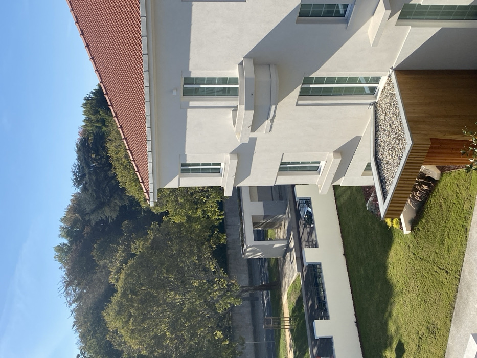 An exterior, high-angle, forensic photograph depicts a residential scene in Lordelo do Ouro e Massarelos, Portugal, under clear daylight. The dominant subject is a multi-story building on the right, featuring light beige stucco walls and a prominent terracotta-tiled roof with light-colored eaves. The building displays multiple rectangular windows with white frames, some equipped with shallow, decorative ledges. A curved, solid-parapet balcony is visible on one floor. At ground level, a rectangular, wood-clad structure with a flat, pebble-covered roof extends from the building, bordered by manicured green lawn. To the left and foreground, a neatly mowed green lawn transitions to a low, white wall topped with dark metal railings. Beyond this, an asphalt road runs parallel to the wall, partially revealing a dark-colored parked vehicle. Further along the road, a light-colored, open-sided structure with a flat roof, possibly a covered parking or walkway, is visible. A large deciduous tree with green foliage stands near the road. The background consists of a dense canopy of various green trees, indicating a forested or park area, under a clear, bright blue sky. No individuals are present in the frame. Shadows indicate a low sun angle, suggesting either morning or late afternoon.
