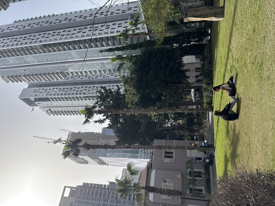 The image depicts a park scene within the Sarona Complex, Tel Aviv, Israel. In the foreground, two individuals are seated on a sunlit green lawn, facing each other in conversation. The person on the left wears a dark long-sleeved top and light pants, while the person on the right wears a light-colored top and dark, loose-fitting pants. Both have dark hair. To the immediate left, a patch of sparse, dry bush is visible. The midground features a light grey, two-story traditional building with a red-tiled roof, white-framed windows, and dark shutters. Two scooters, one appearing to be a delivery vehicle, are parked near its entrance. A variety of trees are present, including tall palm trees, dark green conifers, and some deciduous trees with bare branches. Further back on the right, a dark, upright stone sculpture or monument stands on the grass. To the right of the traditional building, part of another structure, possibly a cafe with outdoor seating and white umbrellas, is visible. The background is dominated by modern high-rise buildings under a hazy, bright sky. On the far right, a tall, slender high-rise with numerous balconies and a grey and glass facade rises. Adjacent to it, another similar but slightly shorter modern high-rise is visible. To the left, a multi-story building is under construction, featuring a large crane at its summit and a distinctive angled glass facade on its lower sections. Another partially obscured residential or office building is visible on the far left.