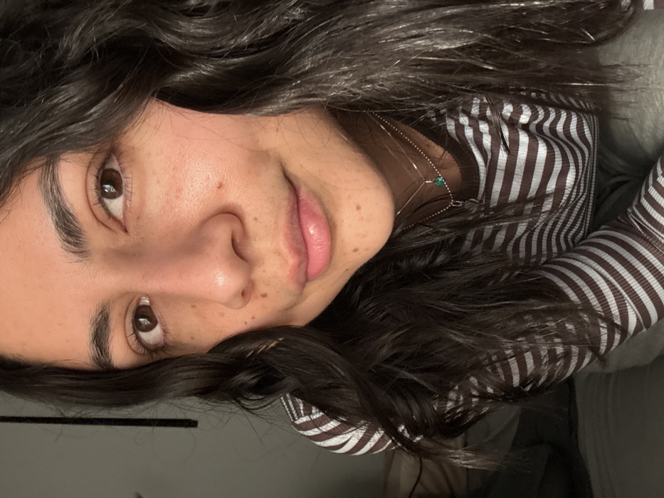 A young woman with brown eyes and long, wavy dark hair poses with her head tilted