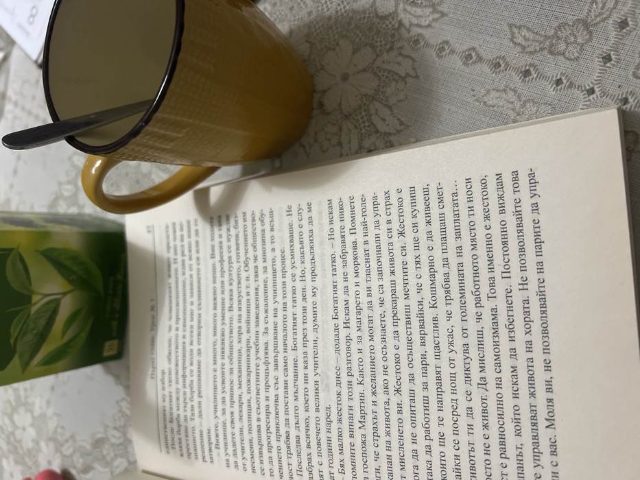 The image depicts an indoor scene on a light-colored, patterned tablecloth, likely located in the city of Byal Izvor, Bulgaria. An open book with white pages and black Cyrillic text is centrally positioned, displaying page 37 at the top right of the left page. To the right of the book, a mustard yellow ceramic mug with a textured surface and a dark brown rim holds a silver-colored spoon. In the background, partially out of focus, stands a green rectangular carton with an image of green leaves and the visible English label "Pure Green Tea." All objects are stationary; no individuals or active actions are observed.