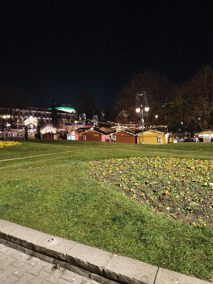 Night scene showing wooden market stalls with glowing string lights, set against a backdrop of trees and illuminated buildings. In the foreground, a grassy area with beds of orange and yellow flowers leads to a stone curb. Above, a dark sky dominates, hinting at urban location during a festive evening.