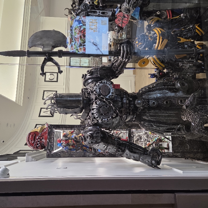 A metal sculpture of a robot warrior holds a large, medieval-style battle-axe. Its body is constructed from various metallic parts, including gears, chains, and pipes. The head features red and yellow elements. The sculpture is displayed in front of a mirrored wall, reflecting the surroundings. The background shows elements of a building interior, like framed pictures.