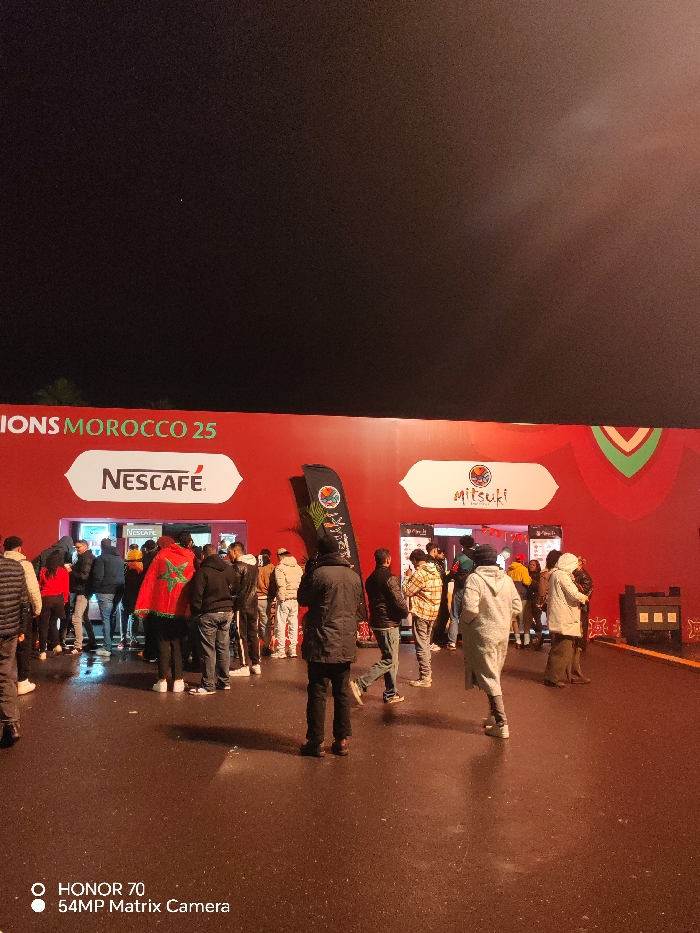 A crowd gathers outside a red building. The building has "MOROCCO 25" written across the top, and two entrances marked by "NESCAFE" and "MITSUIKI" signs. Most people are standing around, with some wearing jackets and winter clothes. A few are entering or exiting the building. The ground looks wet, and the lighting is dim, suggesting it is nighttime or dusk. A Moroccan flag is draped over someone's shoulders.