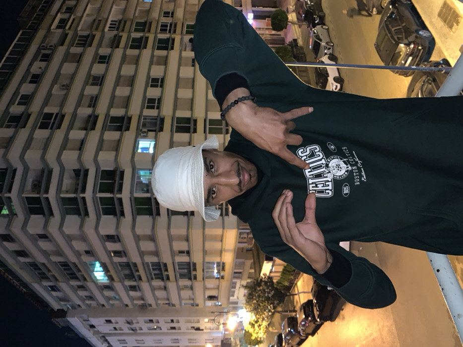 A man wears a white bucket hat and dark green hoodie with "Boston Celtics" across the chest. He is looking directly at the camera and gesturing with both hands, making a rock-and-roll hand sign with one. He is wearing a beaded bracelet on his left wrist. In the background, a tall building with many windows is visible. Below, a street with parked cars is seen, lit by streetlights.