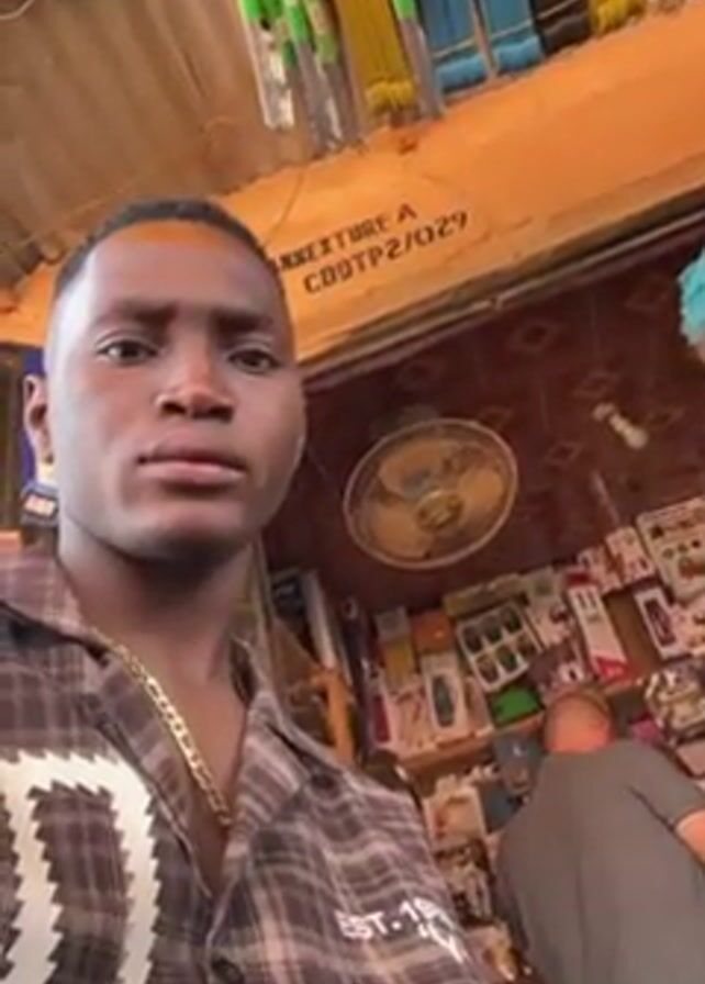 young man recording a selfie video in front of a small shop. The man is wearing a brown and white patterned button-up shirt and a gold chain. He has a serious expression on his face. Behind him, another man is browsing through the merchandise in the shop. The shop is filled with various electronic accessories and other items. A fan is running on the ceiling. There is signage on the shop's upper area, and what appears to be bundles of cables are stored overhead on the outside. The shop appears to be located in a bustling outdoor market or similar setting.