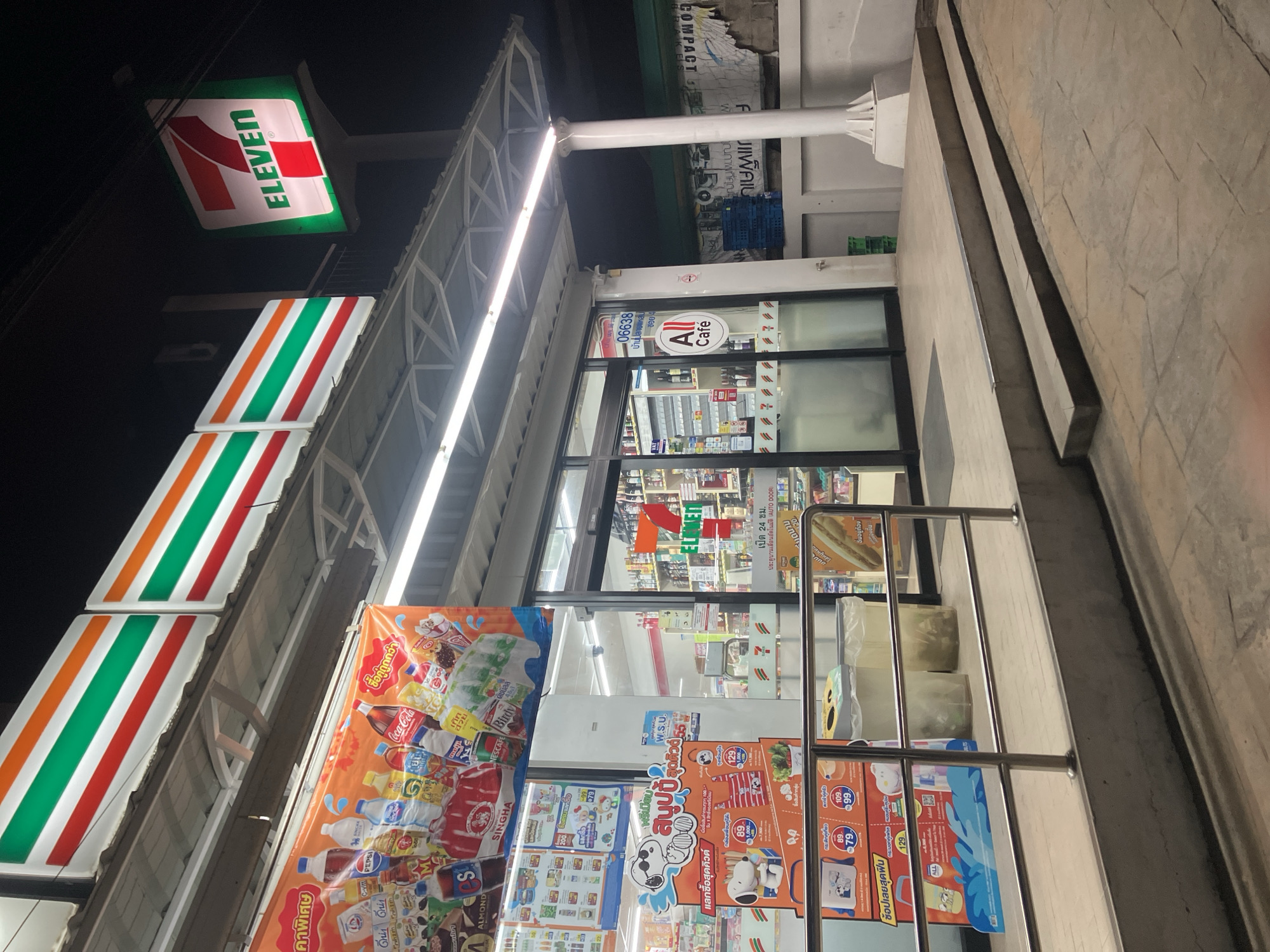 Here's a detailed description of the image: The image is taken at night, focusing on the exterior of a 7-Eleven convenience store in Baan Plai Laem, Thailand. Several 7-Eleven logo signs are visible, stacked vertically on the storefront. The store's entrance is glass-fronted and displays a variety of promotional advertisements for food and beverages, including Coca-Cola, Pepsi, and other local brands. These posters feature both Thai and English text. An "All Cafe" sign is also visible near the entrance. A silver railing is present near the entryway. The concrete structure around the storefront has multiple steps. The OCR also indicates the address as "06638 บ้านปลายแหลม ซอย 4".