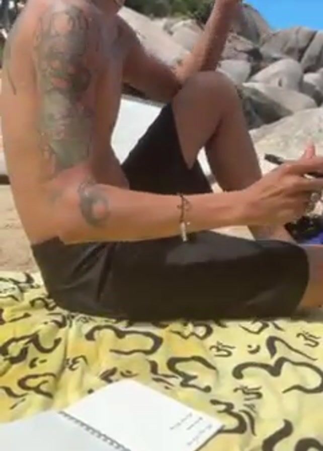 shirtless person with tattoos, wearing black shorts, sitting cross-legged on a yellow blanket with black Om symbols printed on it. The person is writing in a small, spiral-bound notebook with a black pen. The person appears to be on a sandy beach with large rocks and some greenery visible in the background. The sky is blue with some clouds. The camera focuses on the person's torso and the notebook, getting closer to the notebook as the video progresses. The words "Happy Healthy" are written three times on the notebook page in black ink.