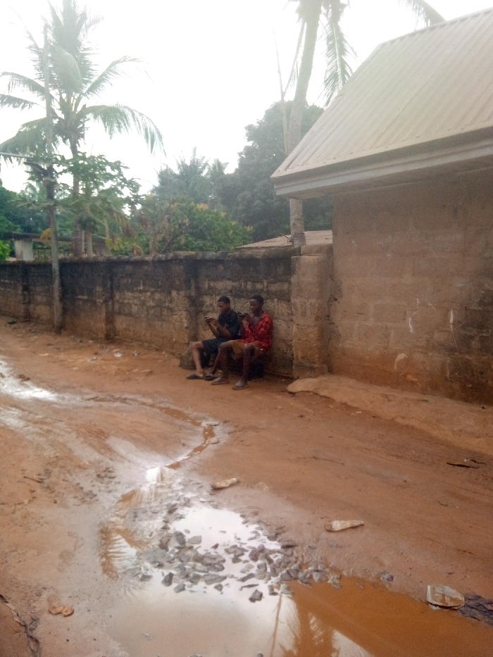 Two young males are seated on the reddish-brown dirt ground in Agbani, Nigeria, leaning against a low, weathered concrete block wall. The male on the left wears a dark shirt and dark shorts, holding a dark smartphone horizontally with both hands. The male on the right wears a red and black checkered long-sleeved shirt and dark shorts, also holding a dark smartphone horizontally. Both individuals are focused on their respective devices. In the foreground, an unpaved dirt path is wet, featuring multiple puddles of water and exposed rocks, indicating erosion. Scattered debris is visible near the puddles. To the right, behind the wall, stands an unpainted concrete block building with a light-colored corrugated metal roof and a visible support pillar. Tall palm trees are present on the left and right sides of the frame, with dense green foliage and trees forming a backdrop behind the wall and building. The sky is overcast.
