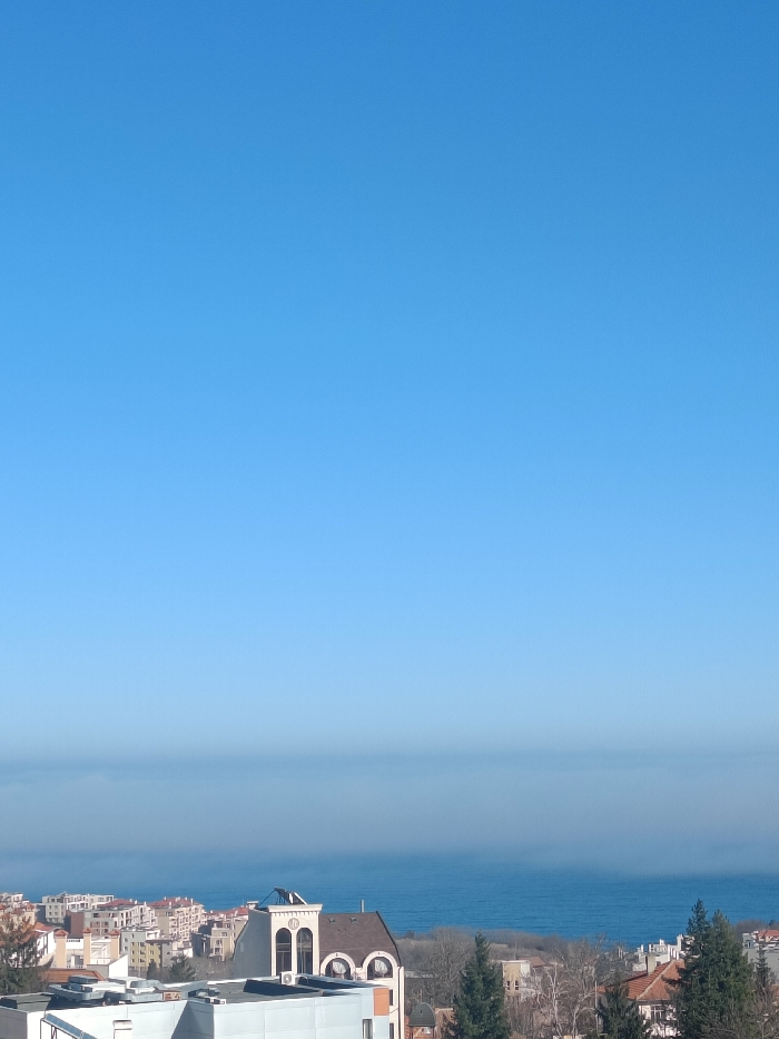 The image displays an elevated panoramic view of the city of Byala, Bulgaria, extending towards the Black Sea under a clear, bright blue sky that dominates the upper two-thirds of the frame. A distinct, low-lying band of light gray atmospheric haze or fog extends horizontally across the sea's surface, partially obscuring the distant maritime horizon. The sea beneath this haze appears a deep blue. The urban landscape in the foreground and midground features a dense collection of buildings. To the lower left, a modern structure with a flat, dark gray roof and lighter gray walls is partially visible. A prominent, multi-story building with a light-colored facade, characterized by multiple arched windows on its upper levels and a dark, sloped roof topped with a small dome-like feature, stands near the center. Surrounding structures include numerous residential and commercial buildings, many with characteristic red or orange tiled roofs. Scattered throughout the cityscape are several dark green evergreen trees and bare deciduous trees. No individuals or human activity are visible within the scene.