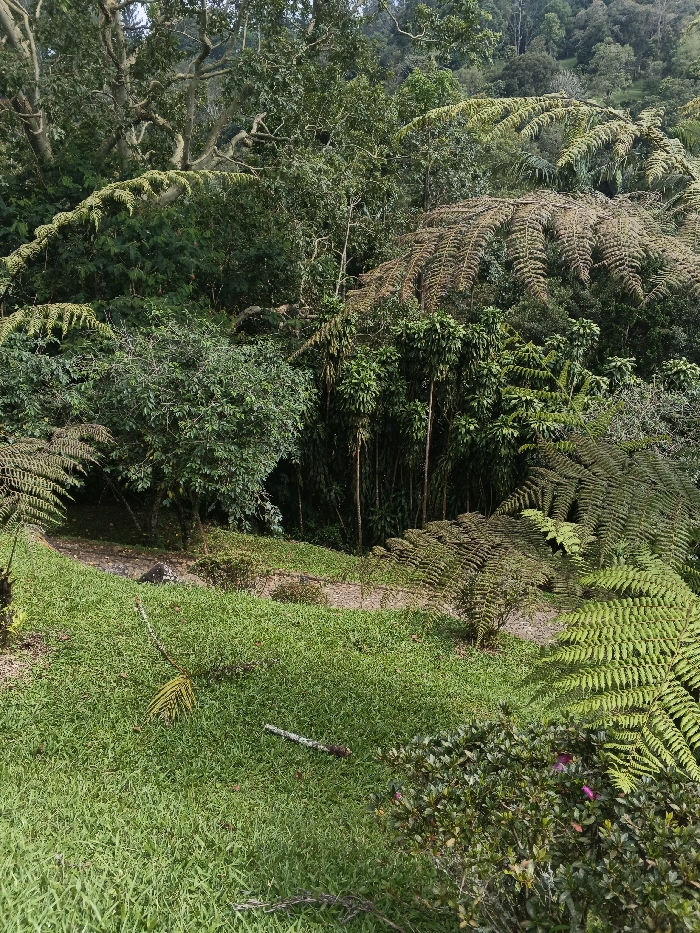 This image depicts a lush, verdant natural environment in Tapaiteng Uesa, Bhutan, characterized by dense vegetation and a descending terrain. The foreground features a manicured patch of bright green grass, with a pale green palm frond and a greyish-white stick or branch lying on it. To the lower right, a dark green shrub with small, reddish-purple flowers is visible. A winding, unpaved dirt path, light brown in color, traverses the midground, sloping downwards and disappearing into thicker foliage. The midground and background are dominated by an abundance of trees and large ferns. Several prominent tree ferns with long, intricate fronds, varying in color from fresh green to brownish-green, are visible. The background consists of a dense forest canopy, displaying numerous shades of green, indicating diverse tree species and thick undergrowth. No individuals, animals, or man-made structures other than the path are present. The scene is illuminated by natural daylight, suggesting an outdoor setting.