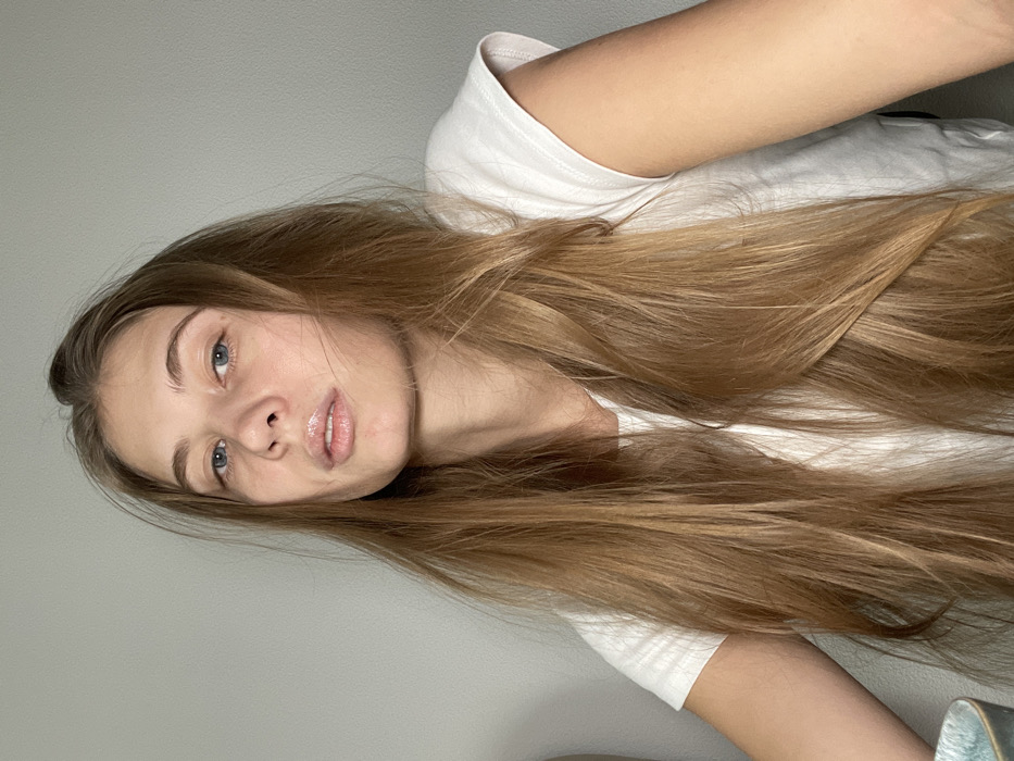 The image depicts a female individual in a medium close-up, facing the camera directly. Her head is slightly tilted to the right. She has long, straight, light brown hair parted on the left side, extending over her shoulders and chest. Her eyes are blue, and her lips appear slightly parted with a glossy finish. She has fair skin. The individual is wearing a plain white short-sleeved top with a ribbed texture. A small portion of a light blue or turquoise ceramic object, possibly a cup or bowl, is visible in the bottom left corner of the frame. The background is an undecorated, light grey or white wall, indicating an indoor setting. The exact location in the city of Khimki, Russia, cannot be determined from the visual information provided within the image.