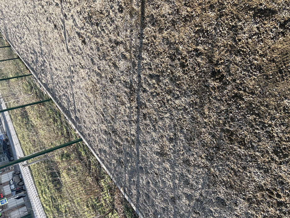 The scene depicts an outdoor urban environment in Anapa, Russia. The foreground features a granular surface composed of light grey gravel mixed with darker soil, illuminated by direct sunlight which casts diagonal shadows across it. A narrow, light-colored concrete curb runs along the left side of the gravel, extending diagonally from the lower left to the upper right. Immediately beyond this curb, a green metal mesh fence with vertical support posts separates the gravel area from a strip of ground containing sparse green grass and bare deciduous bushes. In the background, a paved road is visible, where a dark-colored SUV is parked on the shoulder. An indistinct human figure, dressed in dark clothing, stands near the front left side of the SUV. Further along the road, a lighter-colored sedan is also parked. To the far left, a light-colored commercial building with prominent windows and a white sign displaying red text is present. A pedestrian crossing sign (white triangle with a black pedestrian symbol) is mounted above the building, and a red traffic light or signal is also visible further along the road. The clear light suggests sunny weather.