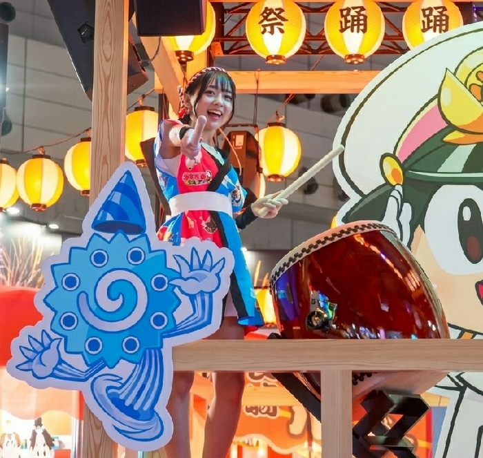 A young East Asian woman, dressed in a vibrant, multi-layered festival costume consisting of a red patterned top, a wide white obi, a blue and black kimono-style outer layer, and a red bandana, is captured mid-action. She smiles broadly, extending her right index finger forward while holding two light-colored drumsticks. To her right, a large, glossy dark red taiko drum with white lacing is positioned on a wooden stand. Partially visible behind the drum is a large cutout of an anime-style character's head wearing a yellow and green hat. To the woman's left, a blue, spiral-bodied cartoon mascot cutout with a party hat is displayed. Above and behind the woman, multiple illuminated yellow paper lanterns, bearing the Japanese characters "祭" (matsuri - festival) and "踊" (odori - dance), are suspended from a wooden framework. The scene is set indoors, within a professionally decorated booth or stage area, indicative of a festival or cultural event, likely within a large exhibition hall or convention center such as Makuhari Messe in Chiba City, Chiba, Japan. The background is blurred, featuring additional festive decorations and lighting elements.