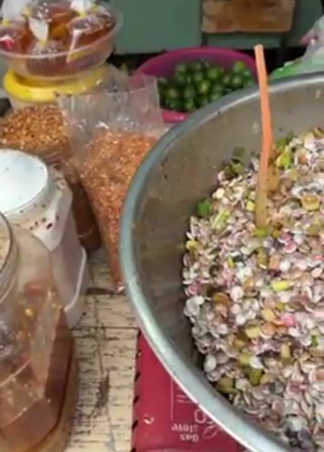 person preparing a dish outdoors. The person is wearing gloves and working behind a table laden with ingredients and condiments. In front of the person is a large metal bowl filled with what appears to be small, colorful shellfish mixed with green herbs and pieces of red chili pepper. A tin can is partially submerged within the mixture. Nearby, there are jars and bags containing various spices, seasonings, and sauces. Limes are visible in a green bowl. The table itself is slightly worn and appears to be set up on a portable gas stove.