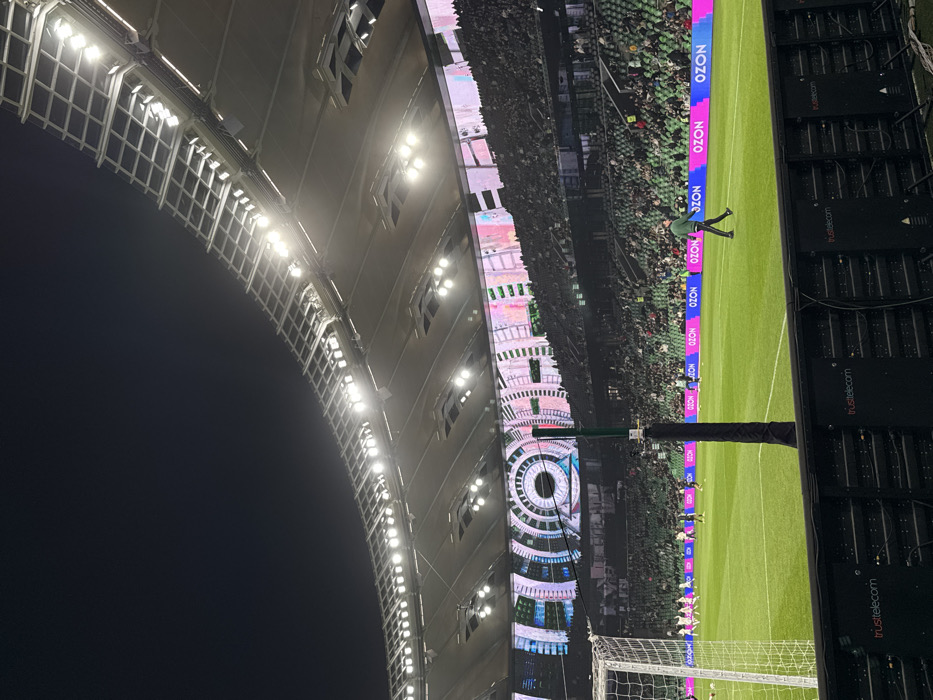 The image displays a night scene inside the Krasnodar Stadium, located in Krasnodar, Russia. The stadium's distinctive curved roof structure, illuminated by numerous bright floodlights, spans the upper portion of the frame against a dark sky. Below, multiple tiers of dark-colored seating are extensively occupied by spectators. A large, curved LED screen wraps around the upper stadium bowl, displaying vibrant, abstract digital patterns, including a prominent concentric circular design. On the green grass pitch, a white goal net is visible on the far left. Several figures in light-colored uniforms are positioned near the goal. In the mid-ground, a lone individual wearing a dark green top and dark trousers walks from left to right across the field. Along the perimeter of the pitch, illuminated LED advertising boards display the "OZON" logo in magenta and blue. Directly below these boards, dark modular structures bearing "trusttelecom" branding are visible. A dark, padded vertical post stands in the mid-foreground, partially obstructing the view of the pitch.