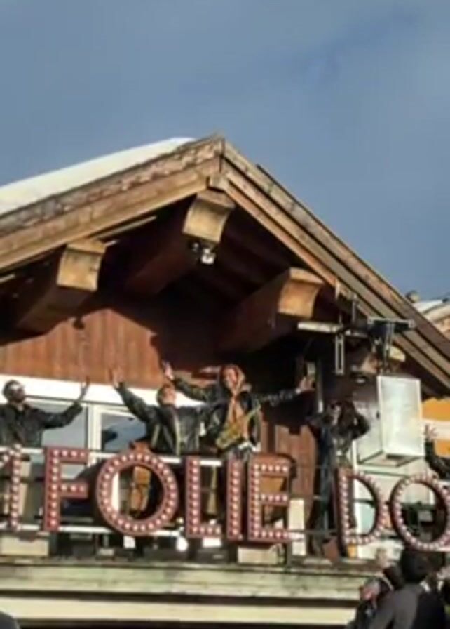 On a wooden structure with a gabled roof, emblazoned with the name "FOLIE DOUCE" in large, illuminated letters, a group of people perform for a crowd. One man, wearing a jacket, plays a saxophone, while others in similar attire dance and wave. The backdrop features a clear, blue sky, with hints of snowy rooftops visible in the distance. Below, the crowd is partially visible, with individuals holding cameras and phones to capture the performance. A few people are wearing ski helmets. The scene suggests a lively, possibly outdoor, entertainment venue.
