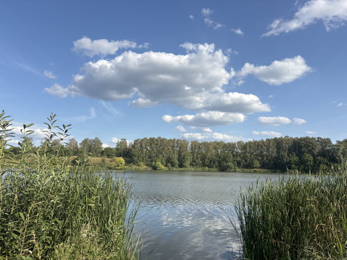 The image displays a natural landscape featuring a body of water, specifically a lake or large pond, situated in Liubotyn, Ukraine. The foreground is occupied by dense, tall green reeds and other emergent vegetation, extending along the lower and side edges of the frame. The midground contains the calm water surface, which exhibits minor ripples and reflects portions of the sky and clouds. The background is defined by a continuous, dense line of green trees across the opposing bank. The sky above is blue with several detached white cumulus clouds. No human figures, discernible man-made objects, or specific actions are depicted.