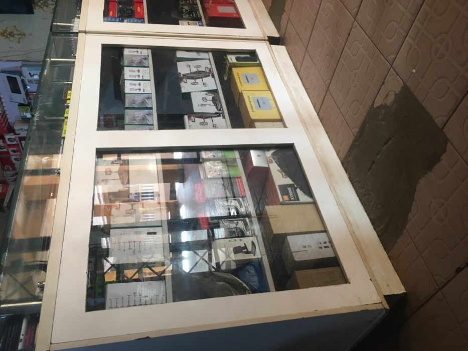 - "The image depicts the interior of a retail shop in Shaba, Nigeria, featuring two white wooden display cabinets with clear glass sliding doors, showcasing various packaged electronic items and accessories" by FM-aWmzn2, licensed under CC BY 4.0