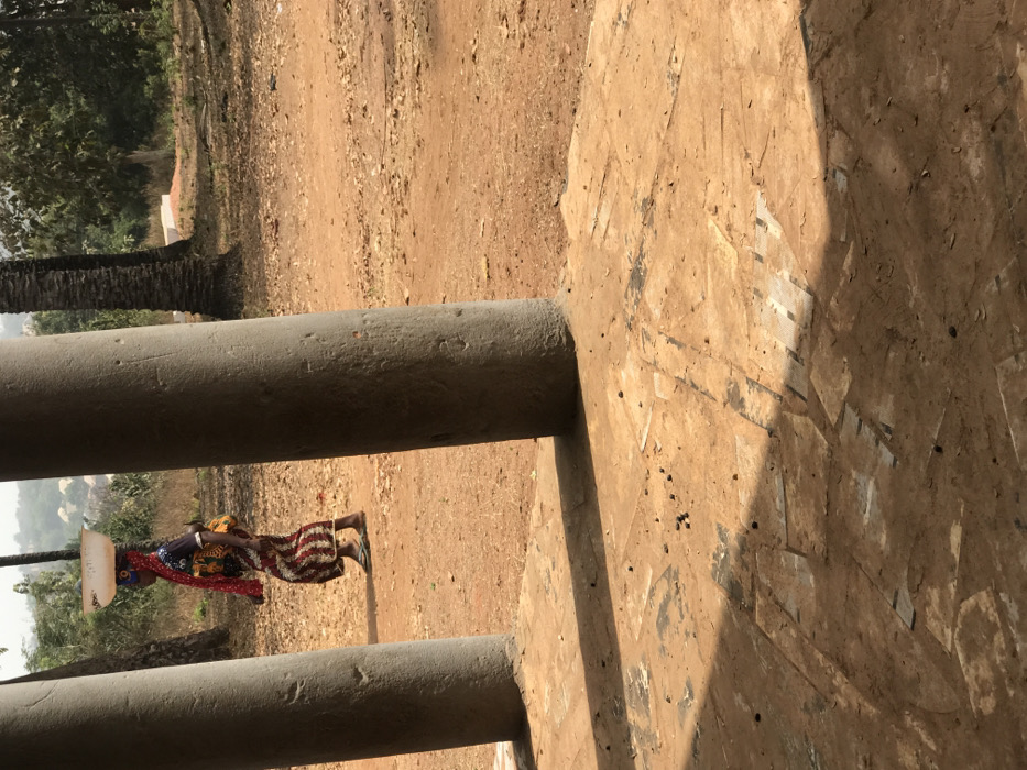 The image depicts an outdoor scene in Egboje, Nigeria, under clear daylight. In the midground, an adult female with dark skin walks from left to right across a reddish-brown dirt path. She is balancing a white, shallow basin on her head and wears a multicolored patterned garment, a dark top, a red headscarf, and light-colored flip-flops. A yellow satchel or bag is visible on her back. Blue markings are present on her face. The foreground is partially framed by two large, textured grey concrete pillars casting shadows onto a dirt and patched concrete surface. The background consists of a dusty, unpaved area with scattered vegetation and several palm trees. Distant hills and a light-colored structure are visible under a hazy sky on the left side of the background. A small white rectangular object is present on the ground to the far right amidst the trees.