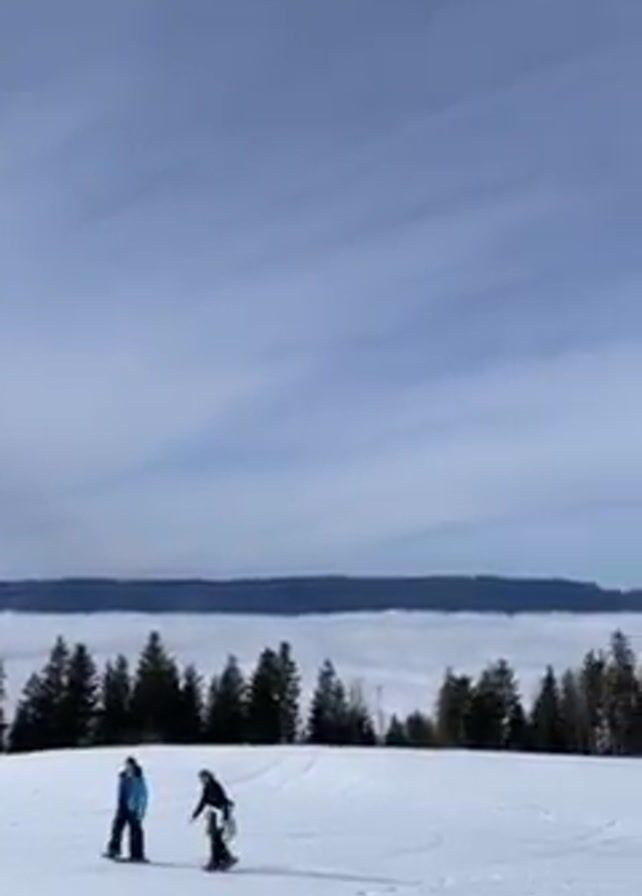 snow-covered field on what appears to be a mountain top. The sky is a light blue with patchy clouds. Several pine trees are visible, and a layer of fog or clouds fills the valley below. Several people are moving around on the snow-covered field. The camera pans across the landscape showing more of the snow-covered area, trees, and cloud cover. There are trails in the snow, possibly from skis or snowshoes.