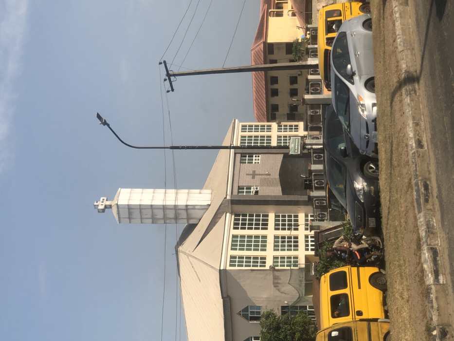 The image depicts an urban street scene in Lagos, Nigeria, under a bright, clear daytime sky. The central subject is a multi-story contemporary church building, characterized by a light-colored facade, a prominent square belfry topped with a cross, and a secondary dark-grey cross emblem on its main exterior wall. Numerous grid-patterned windows are visible. A partially legible green sign near the church's entrance displays a Nigerian mobile number prefix (070...). In the background, to the right of the church, are multi-story residential or commercial buildings with terracotta-tiled roofs. The foreground features a grassy median strip and a concrete curb. Parked along the roadside, facing right, are several vehicles: a yellow commercial minibus (danfo) with a visible passenger, a dark grey SUV, a silver Toyota Prius sedan with a Nigerian license plate, and a section of another yellow commercial minibus. A dark-skinned individual in a light-colored top stands beside a motorcycle, which is positioned between the first yellow minibus and the SUV. Street infrastructure includes a dark-colored street light pole with an LED luminaire and a wooden utility pole supporting overhead power lines. The presence of yellow commercial minibuses (danfos) and the Nigerian mobile number on the sign confirms the location as an urban area within Lagos, Nigeria. The precise street address or name of the church is not discernible from the image.
