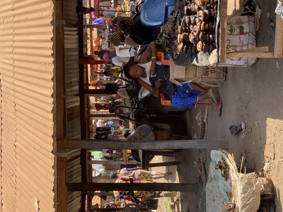 This image depicts an open-air market scene in Nev, Nigeria, under a bright, sunny sky