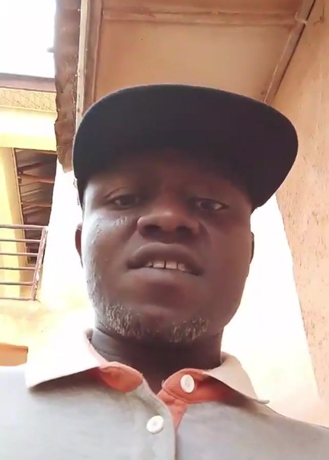 A medium close up shot features a dark-skinned man wearing a gray polo shirt with white collar and orange accent trim, and a black baseball cap. He is looking into the camera and speaking. The background consists of the side of a painted, two-story building. The building has a window with metal bars. The video is shot during daylight hours and appears to be taken outdoors.