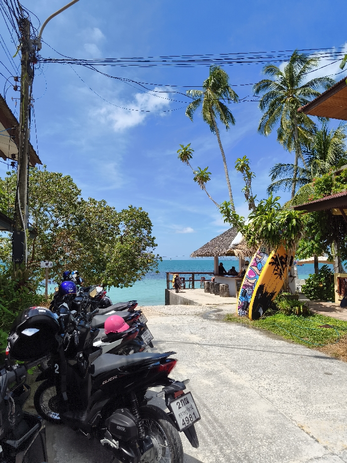 A vibrant tropical scene reveals motorbikes parked roadside near a beach