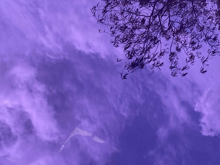 The scene, located in the city of Cotoperíz, Venezuela, depicts an upward view of an outdoor environment, characterized by a pervasive purple color cast. The sky occupies the majority of the frame, featuring scattered clouds of varying density, appearing as lighter purple formations against a darker purple background. In the upper right quadrant, and extending towards the center, the dark, silhouetted branches and leaves of a tree are visible, viewed from below. The leaves are elongated and individually discernible. In the upper left quadrant, a distinct, bright, and curved reflection is present, appearing as a lighter, almost white-purple streak against the darker sky, suggesting a reflective surface such as glass or polished metal. No human subjects, animals, or overt actions are depicted.