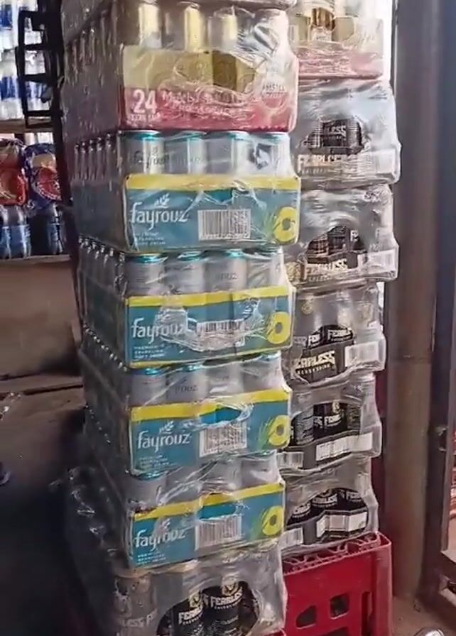 tall stack of beverage packs in a shop. The stack consists of various brands and flavors, including Fayrouz, Amstel Malta, and Fearless. The packs are wrapped in plastic and placed on top of each other, supported by red plastic crates at the base. The camera pans up the stack to show the different products. The background shows a shop setting with shelves and other merchandise. There are people talking in the background.
