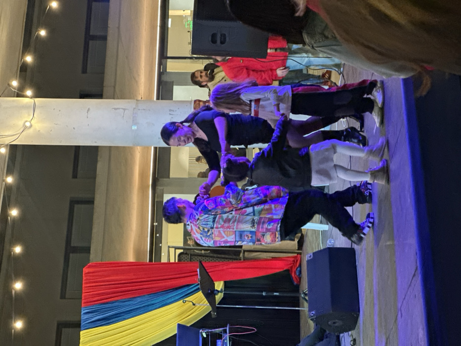 The image captures a nighttime indoor or covered outdoor event on an elevated stage within a modern, concrete-structured venue, specifically identified as being in Alicante/Alacant, Spain. Overhead string lights and blue stage lighting illuminate the scene. Four individuals are positioned centrally on the stage, engaged in dancing. A Caucasian male, estimated 40-50 years old, with short dark hair, wears a colorful, abstract-patterned long-sleeved shirt, dark trousers, and dark sneakers with white striped details. He is holding hands with an East Asian female, also estimated 40-50 years old, with long dark hair tied back, wearing a black v-neck top, black mini-skirt, and black high-heeled boots. She exhibits a broad smile. To the woman's left, a young girl, approximately 5-7 years old, with dark hair, wears a black jacket, white dress/skirt, white tights, and light-colored boots, appearing to hold the woman's hand. To the woman's right, another young girl, approximately 7-9 years old, with light brown hair, wears a white long-sleeved top with red and black stripes, black pants with a red side stripe, and white sneakers, also appearing connected to the dancing group. To the far left of the stage, a backdrop featuring vertical panels of blue, yellow, and red fabric is visible. Adjacent to this are audio equipment, including a black speaker, a music stand, and electronic devices on a table. A prominent grey concrete pillar rises vertically on the stage's right side. In the background, several individuals are observable, including a bearded male in a light-colored jacket and a male in a red jacket. A portion of another black speaker is visible on the far right side of the stage. The stage floor is dark, and exposed concrete walls and ceiling structures are present in the background.