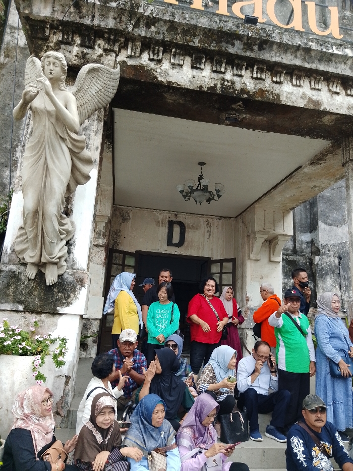 The image depicts a group of approximately 25 individuals gathered at the entrance of a weathered, multi-story stone building in Ngadirejo, Indonesia. A prominent, light-colored statue of a winged, robed female figure stands on a pedestal to the left of the central entrance. The building's facade shows significant aging, discoloration, and some organic growth. Above the main doorway, a large black letter "D" is affixed to the wall, and a multi-bulb chandelier hangs from the portico ceiling. Partial orange lettering, "NADU," is visible on the building's upper facade. The individuals, primarily adults of middle to older age, include both men and women, many of whom wear head coverings (hijabs) in various colors. They are positioned on and around a set of stone steps leading to the entrance. Observed actions include standing, sitting, looking towards the viewer, a man in a green shirt and cap giving a thumbs-up, and several individuals interacting with mobile phones. A planter containing white flowers is visible in the lower-left foreground.