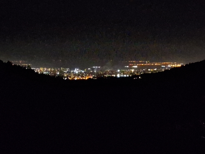 The image displays a wide-angle, elevated nighttime view of the city of Stara Zagora, Bulgaria. The central midground is dominated by the illuminated cityscape, characterized by a dense and varied concentration of artificial lights, predominantly white, yellow, and orange, outlining urban structures, roadways, and residential/commercial areas. The foreground is a dark, indistinct mass, representing the elevated terrain of the vantage point. Dark, silhouetted landforms frame the city on both the left and right sides, indicating surrounding hills or mountains. The sky above is uniformly dark. No individuals, specific actions, or direct interactions are discernible within the frame.