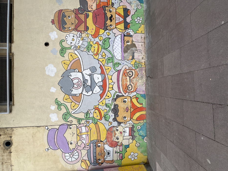 A colorful mural decorates a building's exterior wall. Cartoonish characters of diverse ethnicities are stacked vertically, interwoven with flowers and greenery. Notable is a central character with wings and a peace symbol. The artwork abuts a dark gray brick walkway, suggesting a public space. The wall also features a utility access point and what appears to be a ventilation grille. The mural appears slightly worn in places.